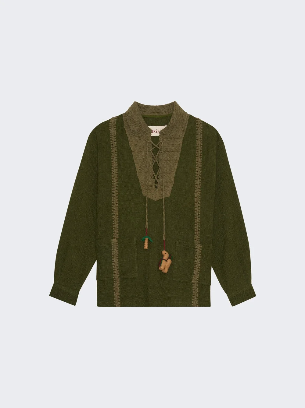 Details - Regular fit - Long sleeves - Lace up neckline - Crochet tassels - Miniature palm tree and camel motifs - Two welt pockets - Care according to label - Material: 100% Cotton Vendor Color Code: Brand Style: BZPS26SW01012 Designer/Brand: BAZISZT