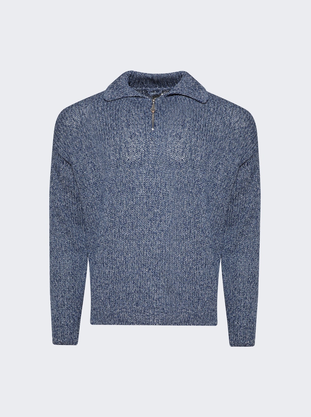 Details - Knit polo sweater - Inspired by a sweater from the 1970s which was made with blue and white melange yarn - Ball-chain zipper at the collar - 100% cotton - Model is 6'1"/185cm and is wearing a size M Brand Style: MRF24KT040 Designer/Brand: BODE