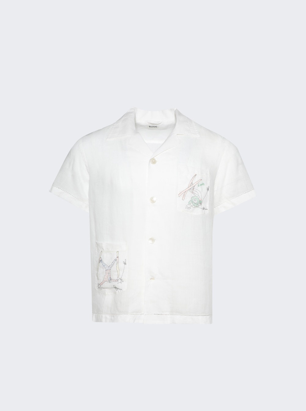 Details - Short sleeve linen shirt - Camp collar - Button down closure - Inspired by a scarf from the midcentury, which was printed with tumbling skiers - Reproduced motif in a delicate, single-thread embroidery - Lightweight linen and has picot detailing along the hem - 100% linen - Model is 6'1"/185cm and is wearing a size M Brand Style: MRF24SH055 Designer/Brand: BODE