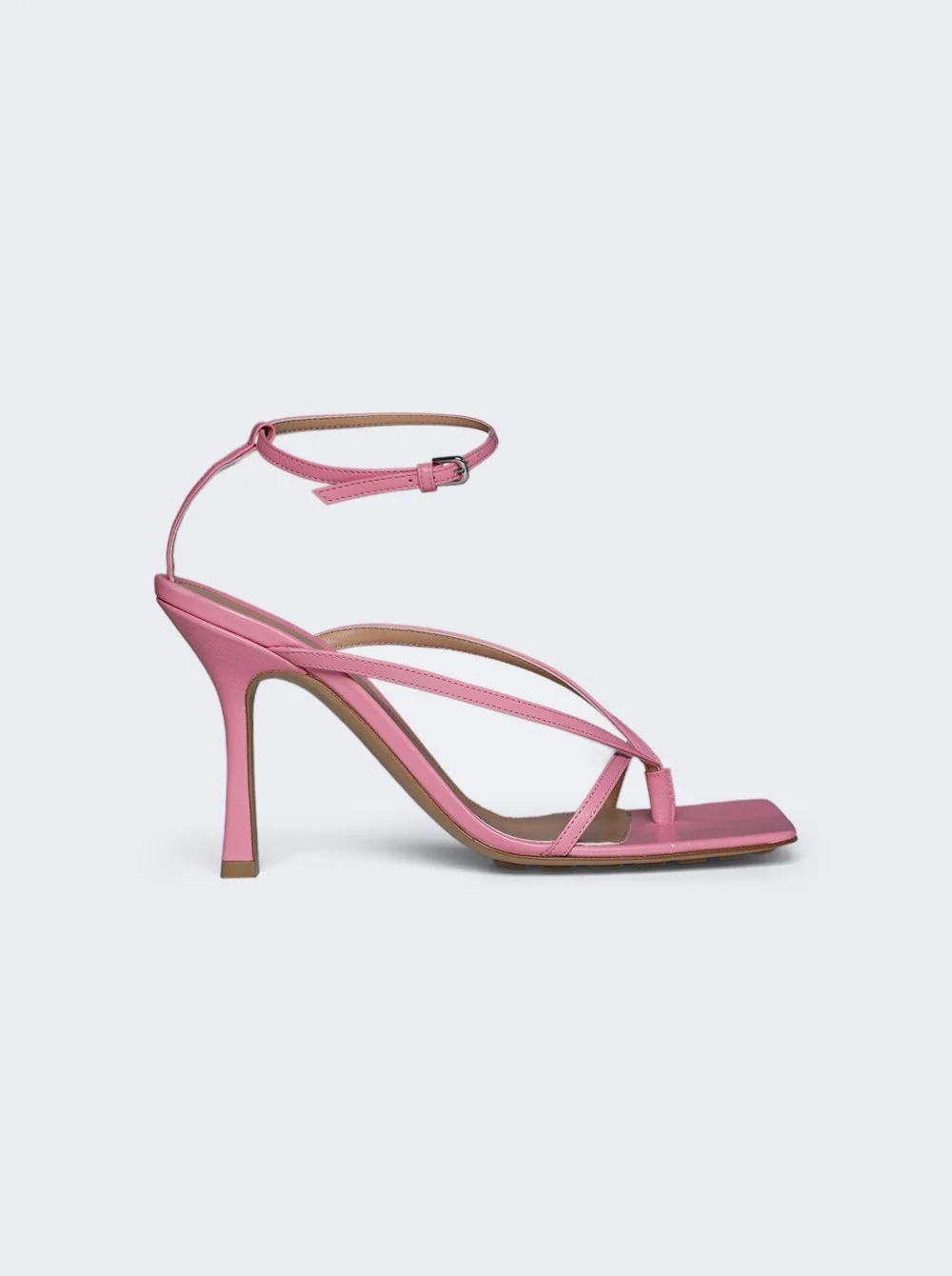 Details - Strappy sandal silhouette - Square open toe - Adjustable ankle bracelet with silver buckle - Stiletto heel - Leather insole and outsole Dimensions: Listed in IT sizing, fits true to size Composition: 100% Lambskin Care: Care according to label Brand Style: 608835VBSF0 Designer/Brand: BOTTEGA VENETA