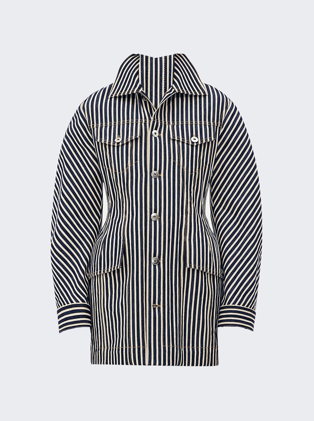 Details - Jacket with signature curved shape - Striped cotton drill. - Front button closure - 4-Pocket design - Cinched at waist - Unlined - Regular fit Dimensions: Model is 5'9"/175cm and is wearing a size IT40 Composition: 100% Cotton Care: Care according to label Brand Style: 792930 V4CW0 Designer/Brand: BOTTEGA VENETA