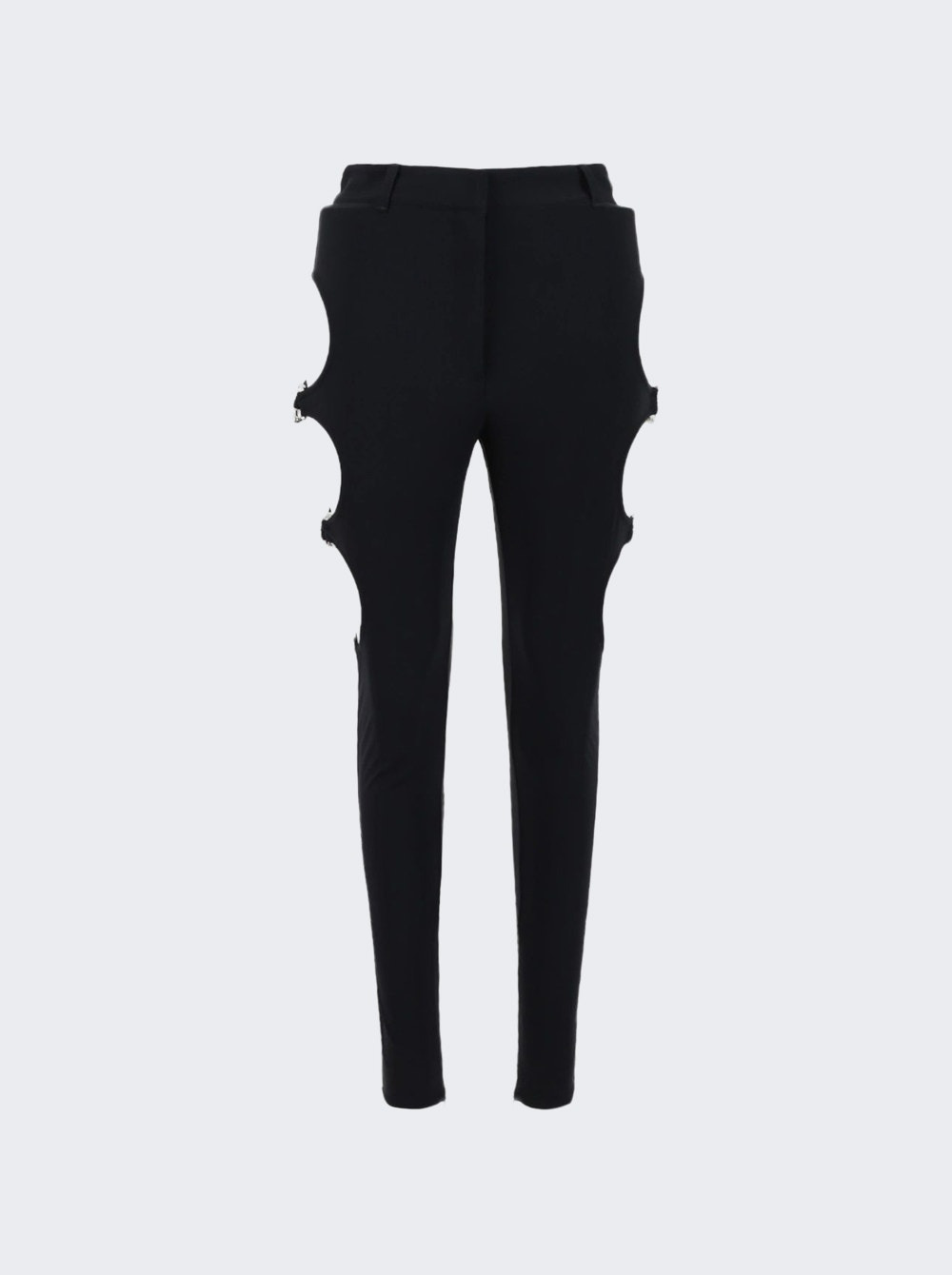 Details - Form fitted silhouette - Leg cut-outs with silver tone links - Zip fly with hook and bar closure - Belt loops - Split toe Dimensions: Model is 5'9"/175cm and is wearing a size US4 Composition: 59% polyamide, 41% elastane Care: Care according to label Brand Style: 8054735 Designer/Brand: BURBERRY