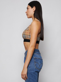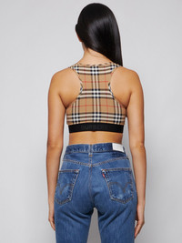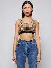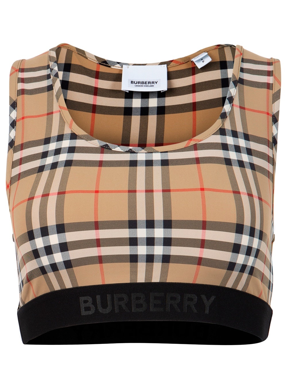 Check sports bra from Burberry featuring a classic fitted silhouette, sleeveless design, scoop neck, elasticated hem with a house logo printed at the front and an allover iconic archive check print. Style it with black joggers and chunky sneakers for a stylish morning workout look. Dimensions: Model is 5'9" /175cm and is wearing a size S Composition: cotton, elastane Care: Machine wash Brand Style: 8049477 Designer/Brand: BURBERRY