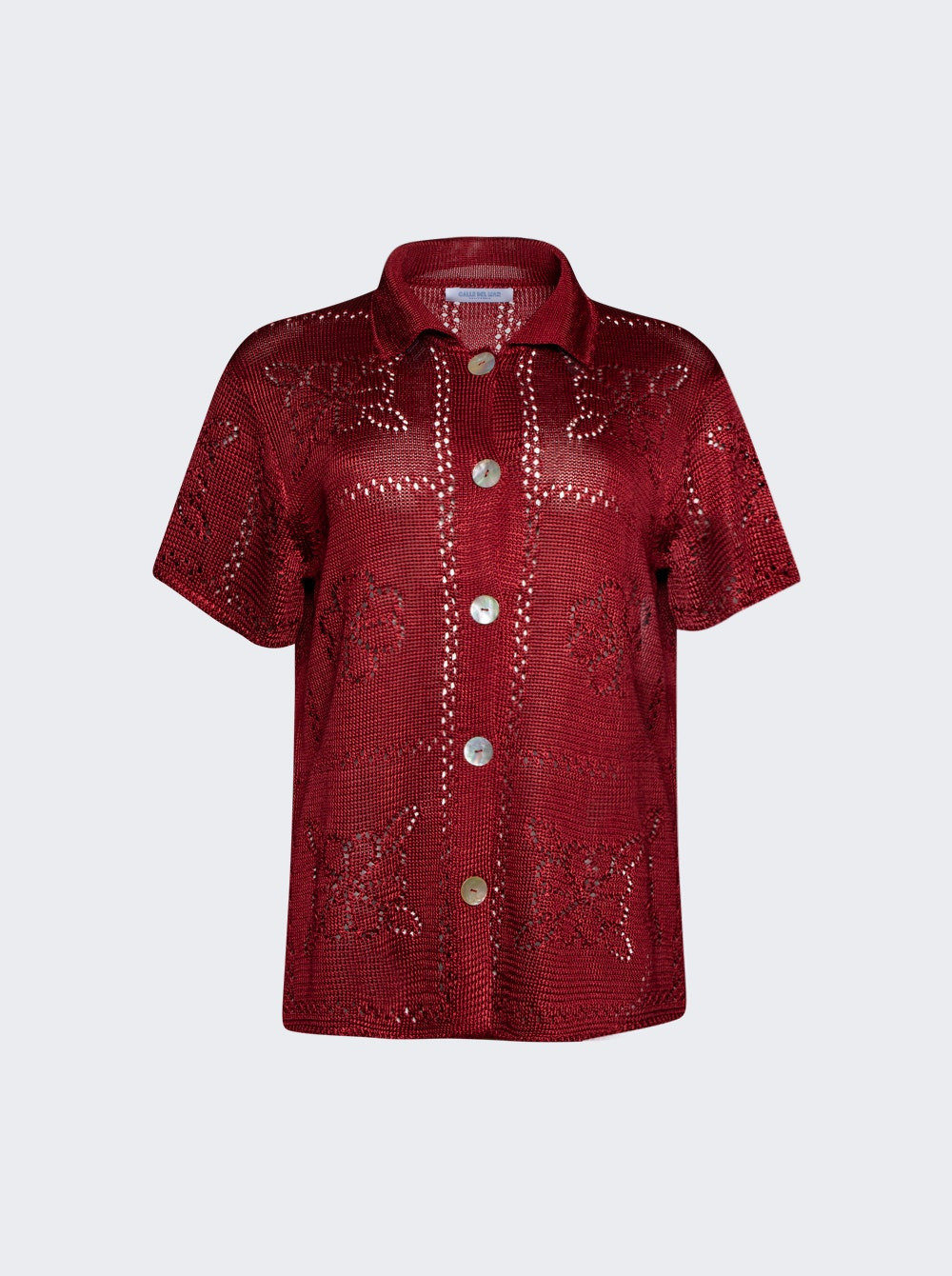 Details - Short sleeve shirt in an intricate pointelle stitch - Floral tile motifs inspired by heirloom crochet tablecloths - Classic pointed collar - Center front placket - Iridescent shell button closure - Relaxed fit - Material: 100% Viscose Size Information: Vendor Color Code: Brand Style: CDM-PS027 Designer/Brand: CALLE DEL MAR