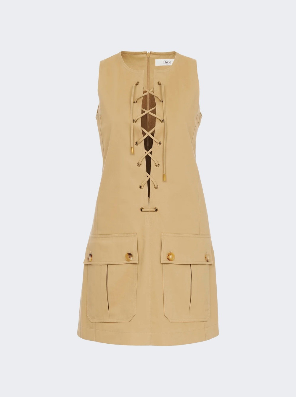 Details - Regular fit - Mini length - Sleeveless - Front lace up fastening - Concealed rear zip fastening - Two front flap pockets - Care according to label - Material: 100% Cotton - Model is 5'9"/175cm and is wearing a size FR36 Brand Style: CH25SRO36339 Designer/Brand: CHLOe