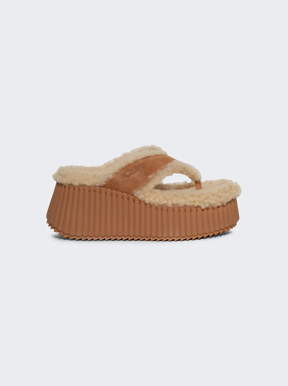 Details - Round toe - Slip on design - Suede and shearling wedge sandals - Logo-debossed thong front - Care according to label - Material: Suede Vendor Color Code: Brand Style: CH25W10XTZ Designer/Brand: CHLOe