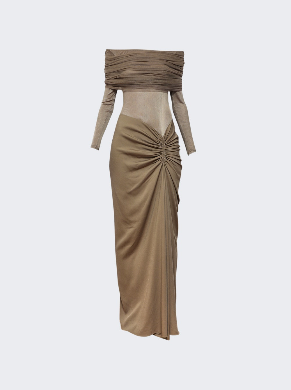 Details - Off-shoulder neckline - Long sleeves - Layered ruching - Sheer mesh bodice - Ruching detail at hip - Maxi length - Care according to label - Material: 97% Viscose, 3% Spandex Size Information: Vendor Color Code: Brand Style: 24043219 Designer/Brand: CHRISTOPHER ESBER