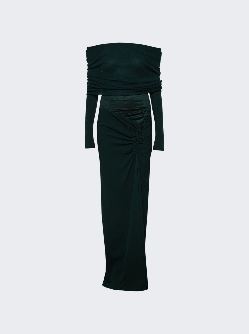 Details - Fitted silhouette - Off the shoulder - Long sleeve - Maxi length - Invisible zip closure - Sheer design - Rib bodice - Ruched design - Care according to label - Material: 97% VISCOSE 3% SPANDEX, 95% VISCOSE 5% ELASTANE, 100% SILK - Model is 5'9"/175cm and is wearing a size AU8 Brand Style: 24043219 Designer/Brand: CHRISTOPHER ESBER
