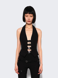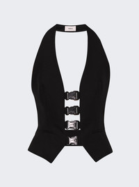 Details - Sleek black waistcoat with plunge neckline - Tonal straps with matte black buckles - A refined top with a nod to utility - Material: Recycled Polyester Size Information: Vendor Color Code: Brand Style: COPT35F3004 Designer/Brand: COPERNI