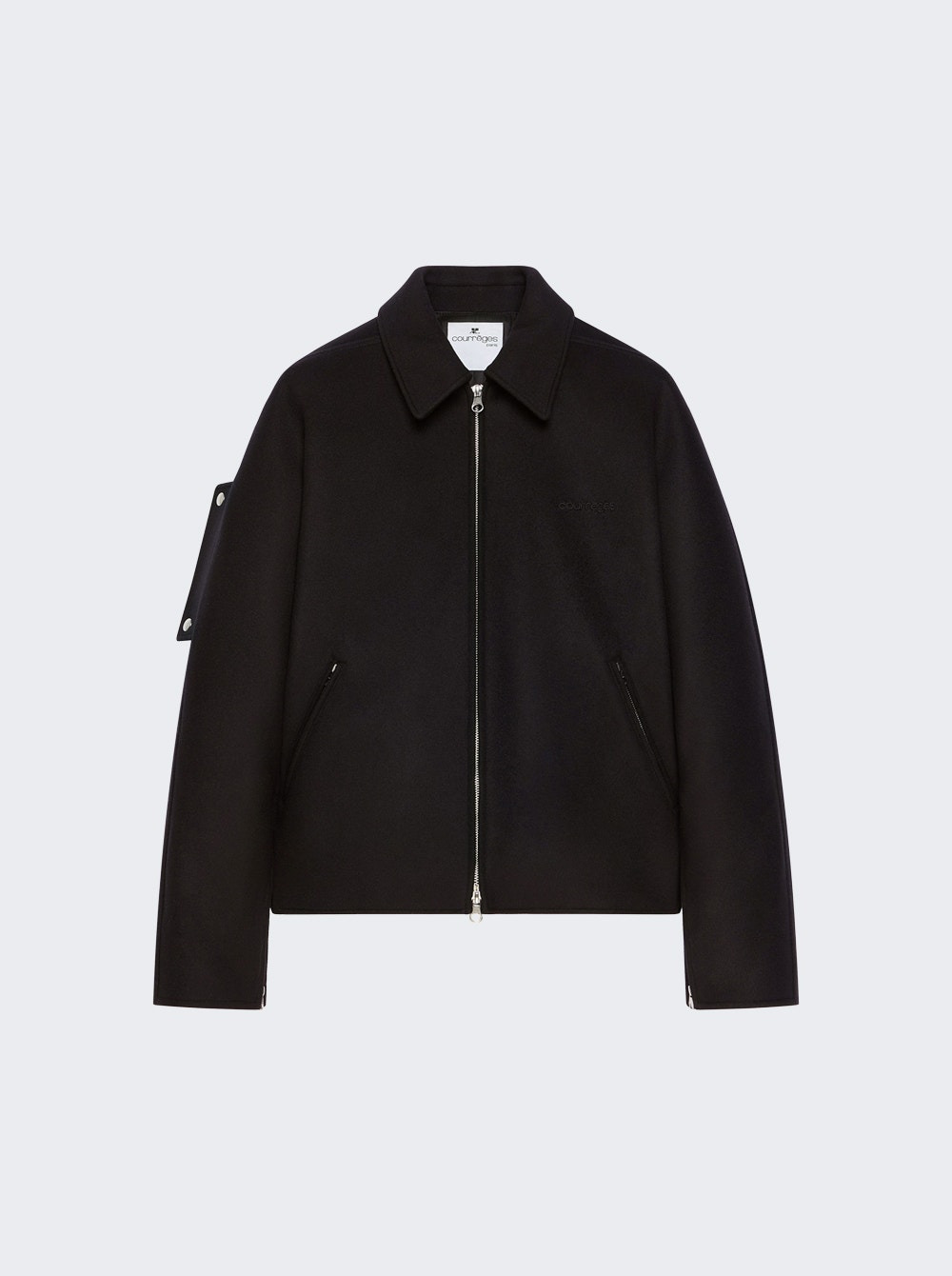 Details - Relaxed fit - Long sleeves - Zip closure - Rib-knit in the back - Side pockets - Embroidered Courreges logo at chest - Zipped sleeves - Care according to label - Material: 97% Wool, 3% Silk Size Information: Vendor Color Code: Brand Style: 325CBL308WO0118 Designer/Brand: COURReGES