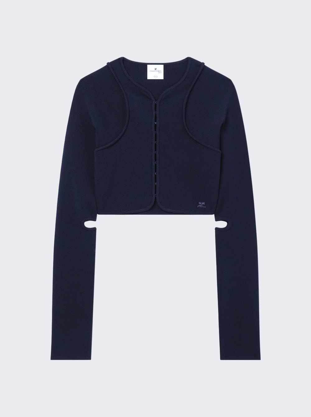 Details - Regular fit - Long sleeves - Front hook and eye fastening - Cut out detailing - Embroidered logo to the side - Care according to label - Material: 70% Viscose, 30% Polyester - Model is 5'9"/175cm and is wearing a size S Brand Style: 125MGI029FI0001 Designer/Brand: COURReGES