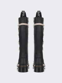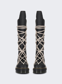 Details - Designed in collaboration with Dr. Martens - Tall leather boots with lacing detail - Exaggerated, oversized tongue - Signature - Mega-lacing in a pentagram shape - Heavy side zip closures - Soft, full-grain Nappa leather with a milled finish - Extra-long laces with silver hooks - Yellow welt stitching - Dr. Martens signature Goodyear Welted sole - Heat-sealed upper and sole for long lasting durability - Material: Nappa leather Size Information: Vendor Color Code: Brand Style: DW02E6811 0001 Designer/Brand: RICK OWENS