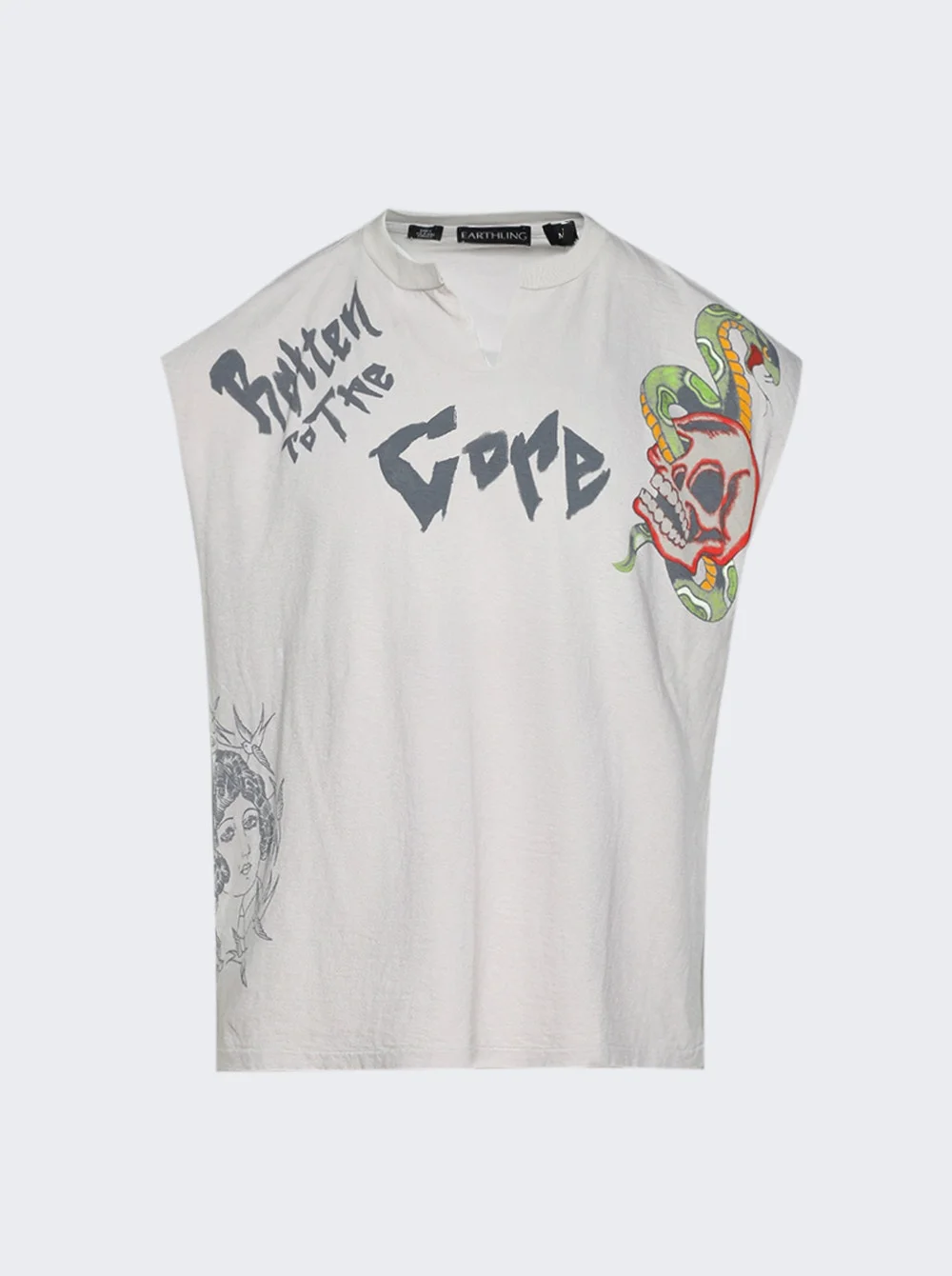 Details - Sleeveless, cut-off t-shirt - Sliced neckline - Tattoo style graphics on the front and back - Armholes with raw hems - Material: 100% Cotton Vendor Color Code: Brand Style: 1043 Designer/Brand: EARTHLING VIP