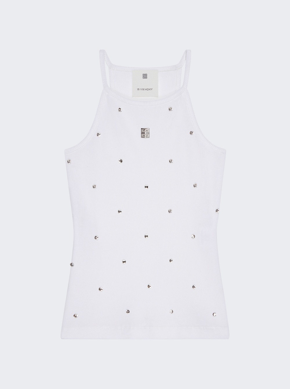 Details - Tank top in ribbed cotton - Embroidered crystals on the front - 4G metal piece on the front - Slim fit Dimensions: Model is 5'9"/175cm and is wearing a size S Composition: Fabric blend Care: Care according to label Brand Style: BW70CA3YNK Designer/Brand: GIVENCHY