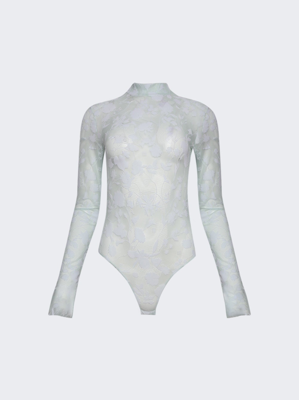 Details - Long-sleeved bodysuit in transparent tulle - High neck - 4G Flowers pattern in flocked velvet - Hook fastening on the crotch and zipper on the back Dimensions: Model is 5'9"/175cm and is wearing a size S Composition: 82% Polyamide, 18% Elastane Care: Care according to label Brand Style: BWB01G20G4371 Designer/Brand: GIVENCHY