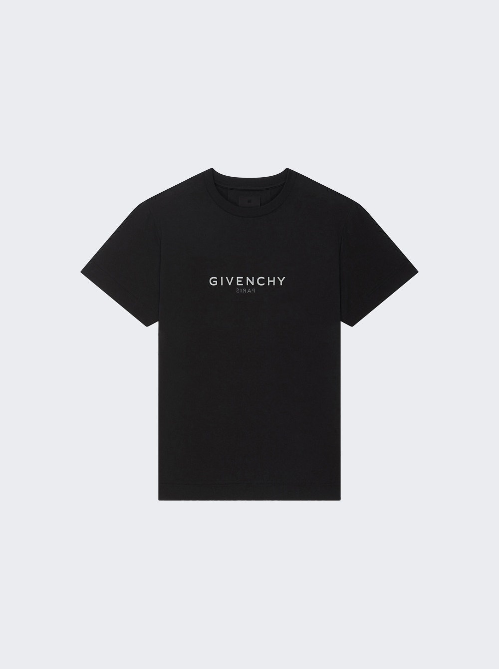 Details - Short-sleeved - Crew neck - Reverse-effect GIVENCHY Paris signature printed on the front and back - Small 4G emblem printed on the lower back - Slim fit Dimensions: Model is 6'1"/185cm and is wearing a size M Composition: 100% Cotton Care: Care according to label Brand Style: BM71653Y6B001 Designer/Brand: GIVENCHY