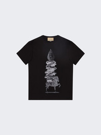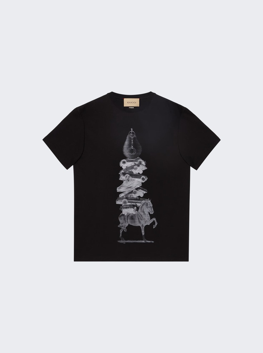 Details - Black cotton jersey - Artwork by Ed Davis - Gucci heritage and horse graphic print - Crewneck - Short sleeves - Rib trim Dimensions: Model is 6'1"/185cm and is wearing a size M Composition: 100% Cotton Care: Care according to label Brand Style: 771758 XJGIC Designer/Brand: GUCCI