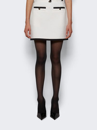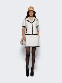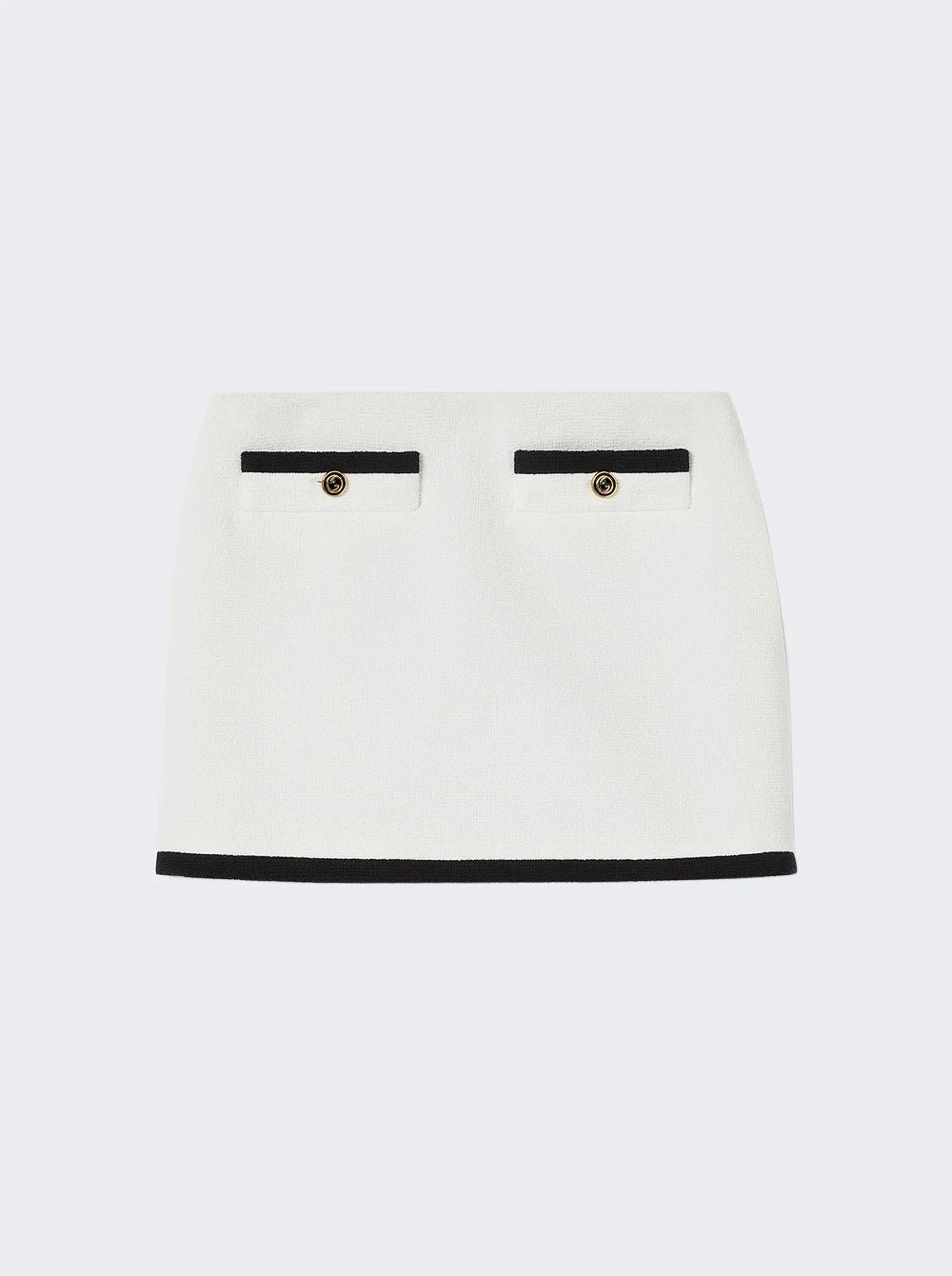 Details - Off-white cotton tweed - Black trim - Round Interlocking G enameled buttons - Lined - Low waist - Two front pockets with buttons - Zip closure - Mini length Dimensions: Model is 5'9"/175cm and is wearing a size IT40 Composition: 91% Cotton, 9% Polyamide; Lining: 100% Viscose Care: Care according to label Brand Style: 784908 ZAQHX Designer/Brand: GUCCI