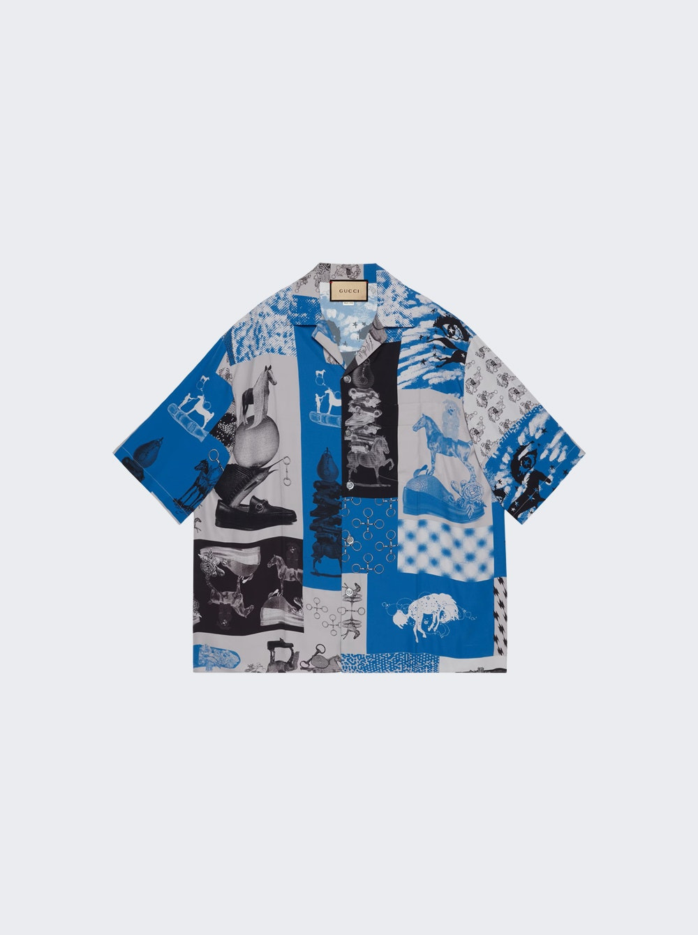 Details - Gucci heritage patchwork graphic print - Artwork by Ed Davis - Short sleeves - Front chest pocket - Front button closure - Oversize fit Dimensions: Model is 6'1"/185cm and is wearing a size EU48 Composition: 100% Viscose Care: Care according to label Brand Style: 782625 ZAQC7 Designer/Brand: GUCCI