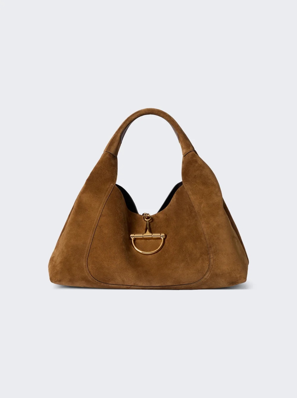 Details - Brown suede large shoulder bag - Oversized half horsebit detail - Gold-toned hardware - Detachable inner pouch - Shoulder strap drop: 7.9" - Size: 18.1"W x 10.2"H x 6"D - Material: Leather Vendor Color Code: Brand Style: 837466 AAFLB Designer/Brand: GUCCI