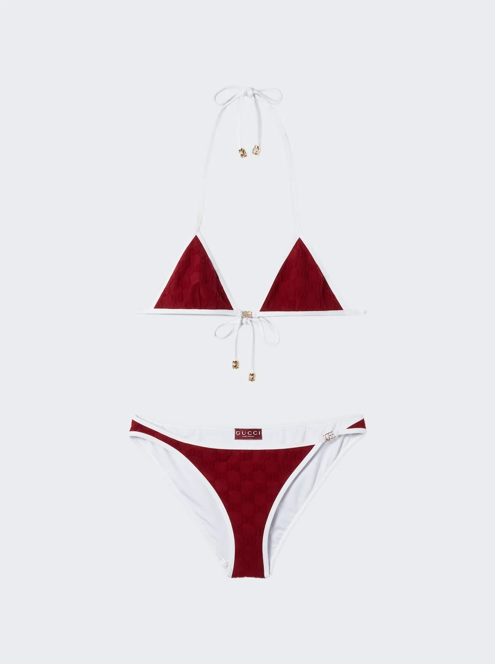 Details - Two piece set - Halterneck - Laces closure at the back and front - Gucci Rosso Ancora red GG terrycloth jersey jacquard - White trim - Double G hardware - Care according to label - Material: 95% Polyamide, 5% Elastane Vendor Color Code: Brand Style: 835965 XHAKP Designer/Brand: GUCCI