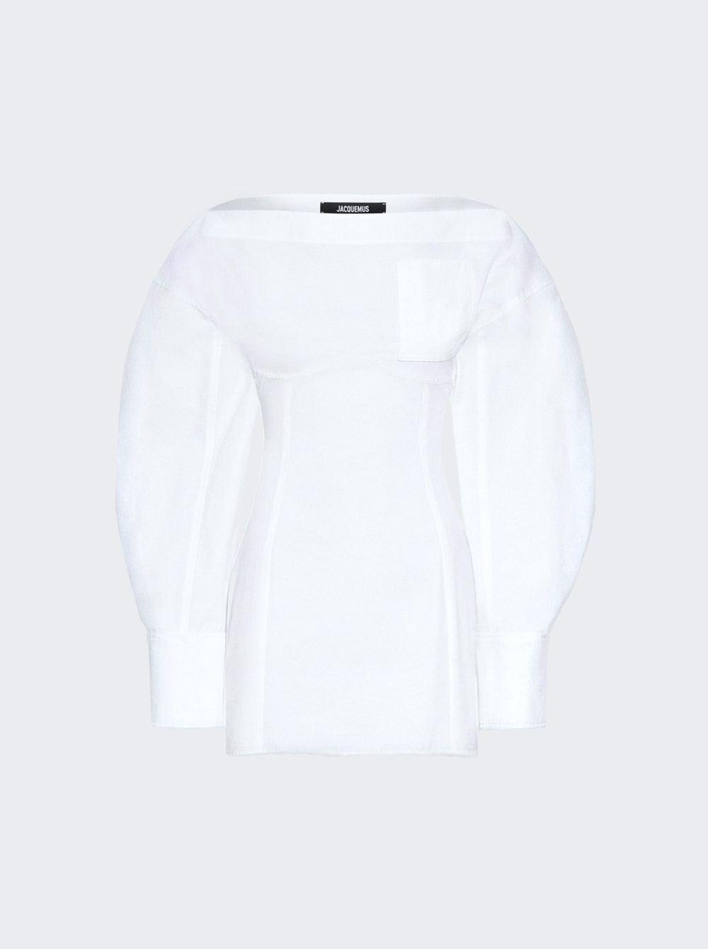 Details - Regular fit - Mini length - Boat neck - Long sleeves - Balloon sleeves - Patch pocket - Belted waistband - Rear zip fastening - Care according to label - Material: 100% Cotton - Model is 5'9"/175cm and is wearing a size FR36 Brand Style: 243DR199-1520 Designer/Brand: JACQUEMUS