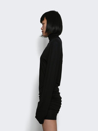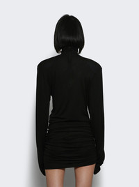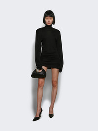 Details - Fitted silhouette - High turtleneck - Rounded shoulder-pads - Extra long sleeves - Gathered and draped side-seams - Embroidered “J” on the hip - Invisible zipper in the back - Asymmetric knee-length hem - Care according to label - Material: 88% Viscose, 12% Silk Size Information: Vendor Color Code: Brand Style: DRW00710AJ00234 Designer/Brand: JACQUEMUS