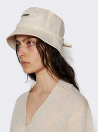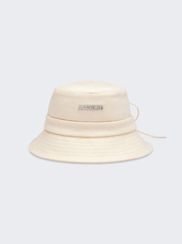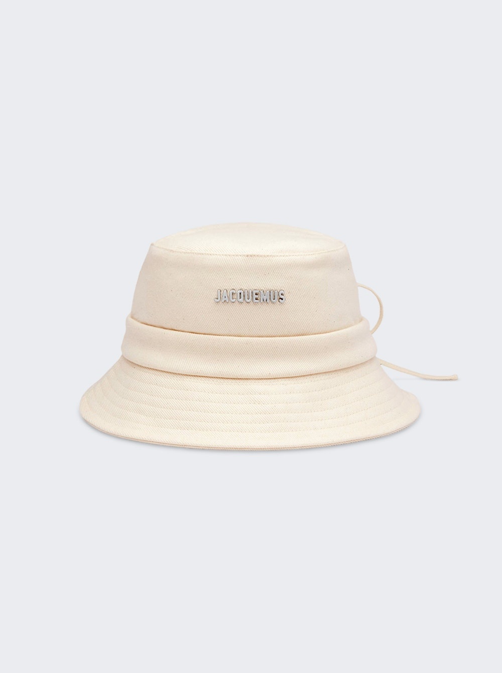 Details - Knotted bucket hat - Cotton - Silver metal logo - Visible topstitched drawcord in the back that can be tied in a bow - Topstitched brim Dimensions: True to size Composition: 100% Cotton Care: Care according to label Brand Style: 223AC001-5001 Designer/Brand: JACQUEMUS