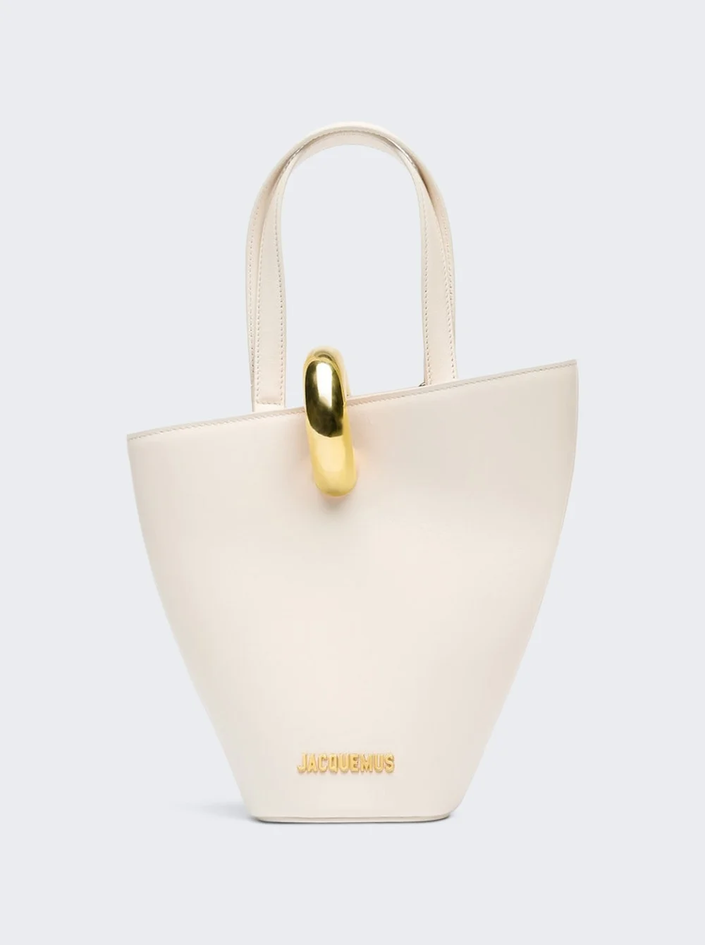 Details - Asymmetric, smooth leather mini bucket bag - Removable cross-body strap - Ring clasp in gold-plated metal - Double top-handles - Interior zipped pocket - Topstitched details - Gold-plated logo and hardware - Fully lined in cotton - Dyed edges - Material: 100% Cow Leather; 100% Cotton Size Information: Vendor Color Code: Brand Style: BAW00389AC01C01 Designer/Brand: JACQUEMUS