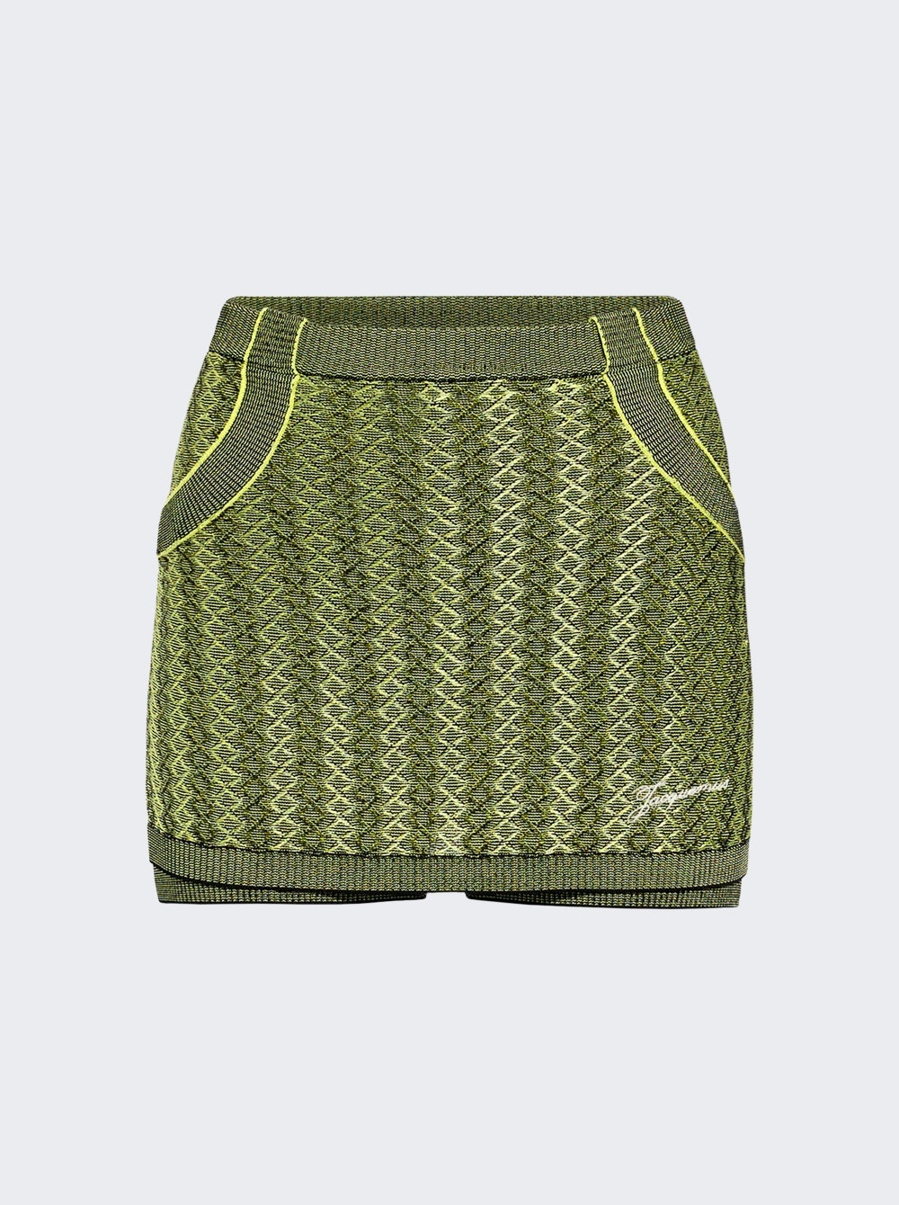 Details - Regular fit - High waisted - Braided motif - Contrast ribbed waist - Trompe l’oeil pocket - Embroidered logo - Visible shorts in the back - Care according to label - Material: 93% Viscose, 4% Polyester, 3% Elastane - Model is 5'9"/175cm and is wearing a size FR36 Brand Style: 251KN606-2433 Designer/Brand: JACQUEMUS