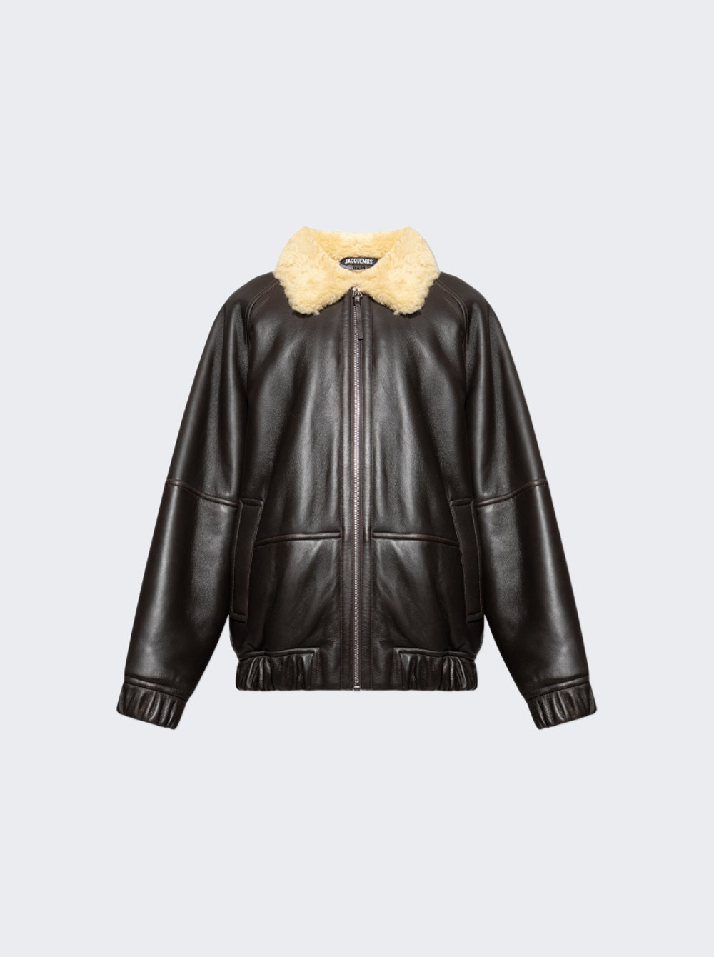 Details - Oversized fit - Double-sided lambskin leather shearling - Contrast fur pointed collar - Raglan sleeves with elastic cuffs - Zipped closure with long leather puller - Large welt pockets - Stitched seams - Fitted elastic hem - Embossed logo patch on the back - Material: 100% Lamb leather Size Information: Vendor Color Code: Brand Style: OUM00128AC16L05 Designer/Brand: JACQUEMUS