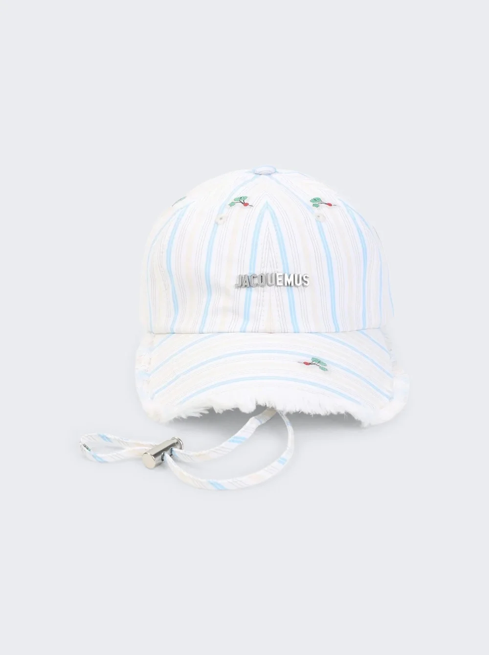 Details - Frayed striped cotton poplin baseball hat - Vegetable embroidery - Long adjustable strap - Silver metal logo and stopped - Material: 100% Cotton Vendor Color Code: Brand Style: 26EACU00452AW00748 Designer/Brand: JACQUEMUS