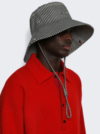 Details - Stitched cotton seersucker bucket hat - Long, adjustable strap - Topstitched visor - Side snaps - Circle and square ventilation grommets - Circle and square loop drawstring at back - Silver metal logo - Material: 100% Cotton Size Information: Vendor Color Code: Brand Style: ACU00721AD00046 Designer/Brand: JACQUEMUS