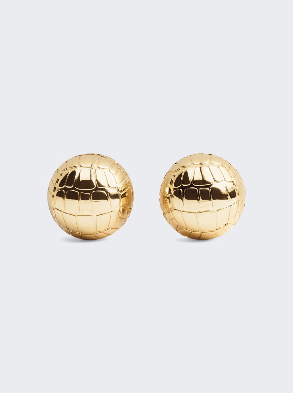 Details - Engraved crocodile-motif circle earrings - Golden brass - Circular shape - Engraved circle and square push-backs - Smooth finish - Debossed logo - Material: 100% Brass Brand Style: 251JW736-5223 Designer/Brand: JACQUEMUS