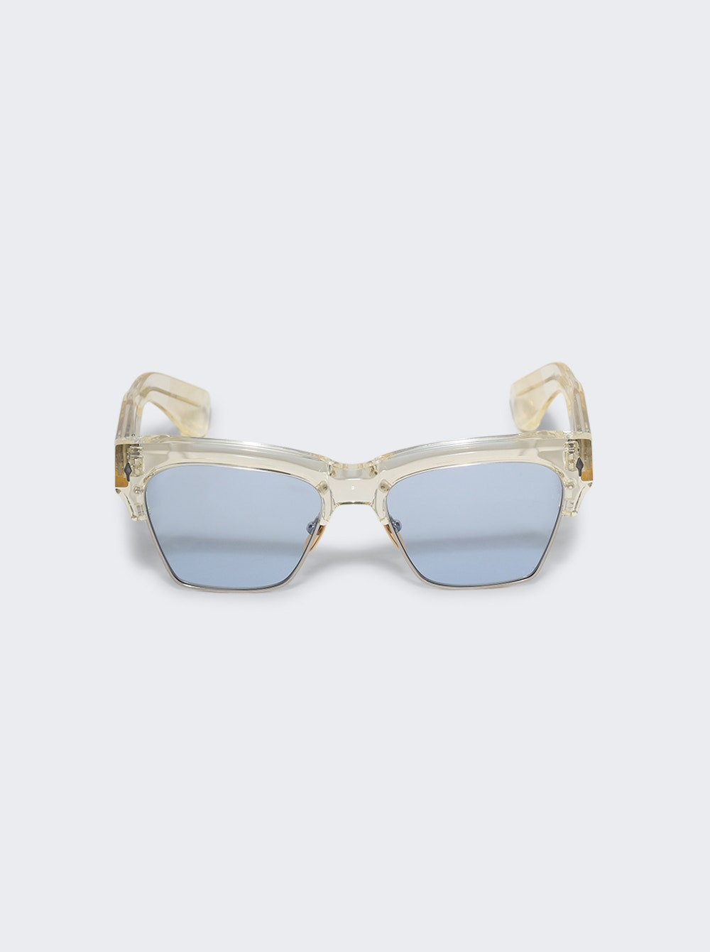 Details - Mid-century classic combo sunglasses with a medium fit. - Handcrafted sleek titanium lens rim and clear crystal cured acetate monobrow and temples. - Beta titanium and acetate frame - Blue lenses with anti-reflective treatment - Signature arrowhead front pin - 100% UV protection - Temple length: 145mm; Frame Width: 146mm; Lens width: 55mm; Lens height: 41mm; Bridge: 19mm Vendor Color Code: Brand Style: J-ESN-UB-T1014Q Designer/Brand: JACQUES MARIE MAGE
