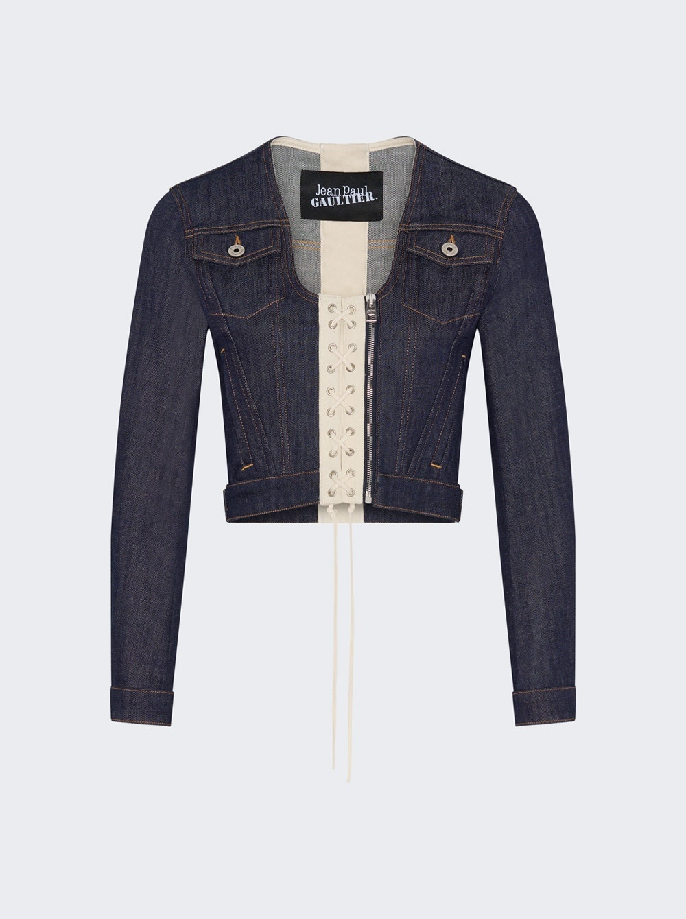 Details - Slim fit - Long sleeves - U neck - Two flat pockets - Two piped pockets - Asymmetrical zip fastening - Care according to label - Material: 98% Cotton, 2%Elastane - Model is 5'9"/175cm and is wearing a size S Brand Style: 25/33-F-VE085-D019-5568 Designer/Brand: JEAN PAUL GAULTIER