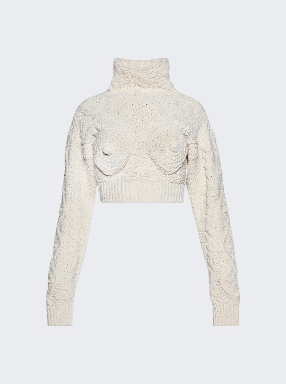 Details - Cotton-blend, chunky knit sweater - Cropped fit - Iconic Madonna conical-bra detail - Rolled turtleneck - Rib knit hem and cuffs - Dropped shoulders Dimensions: Model is 5'9"/175cm and is wearing a size S Composition: 85% Cotton, 15% Polyamide Care: Care according to label Brand Style: 24/31-F-PL058-M081-64 Designer/Brand: JEAN PAUL GAULTIER