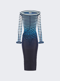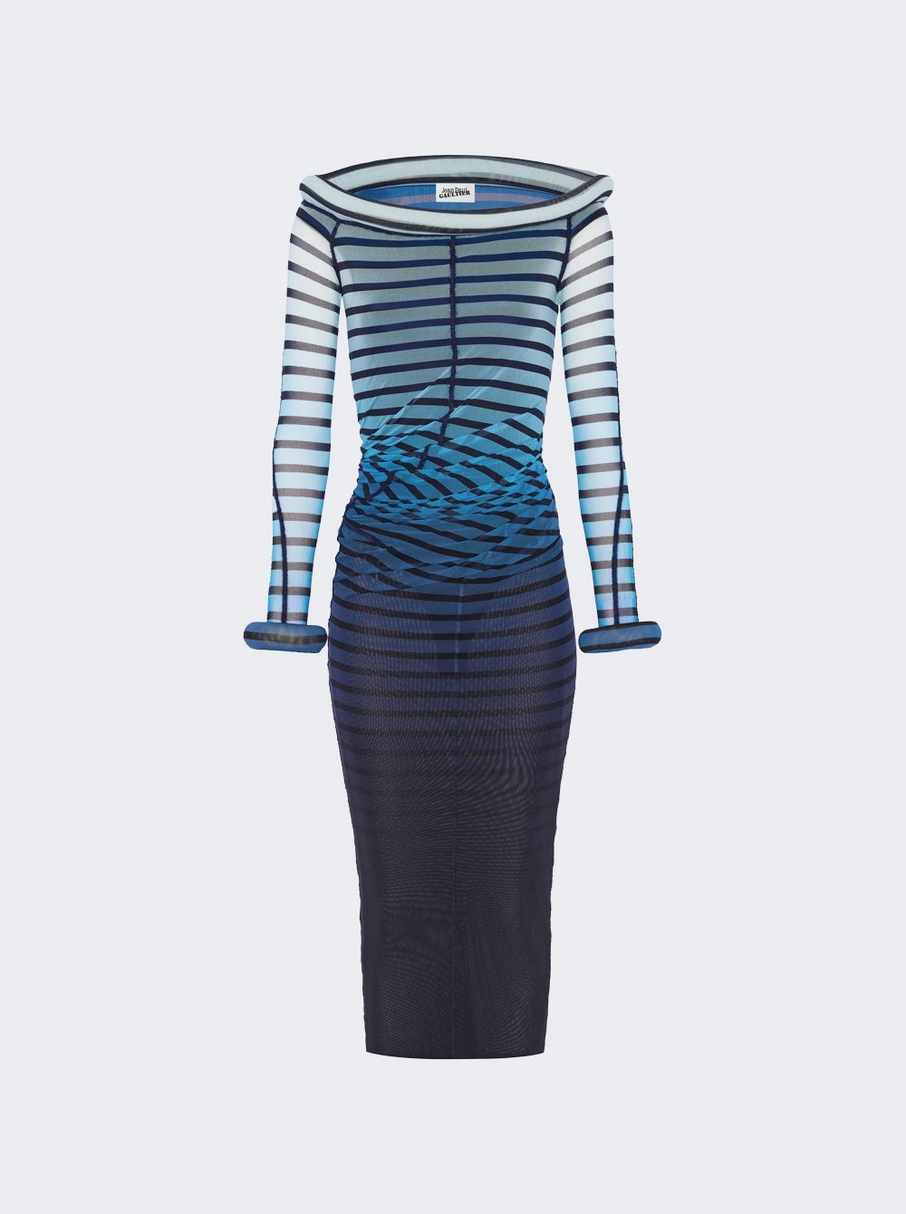 Details - Long twisted blue mesh gradient - Mariniere stripe print - 3D-finished cuff and collar details - Tight twisted fit - Boat neck - Stretchy material - Off-the shoulder long sleeves - Main material: 100% polyamide - Secondary materials: 80% polyamide, 20% elastane - Model is 5'9"/175cm and is wearing a size S Brand Style: 25/33-F-RO294-T575-005956 Designer/Brand: JEAN PAUL GAULTIER