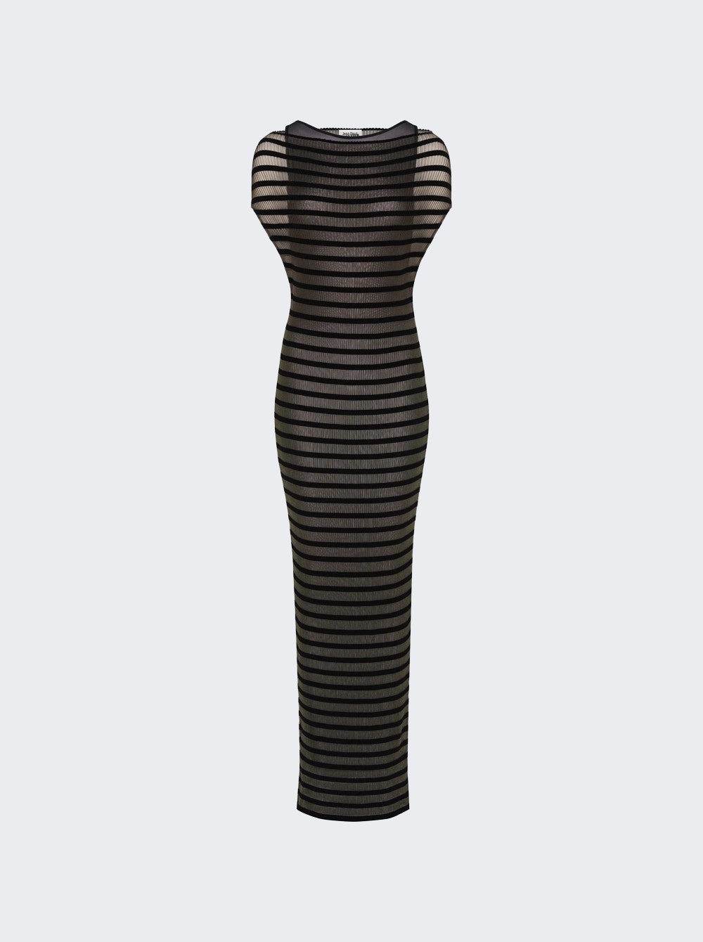 Details - Semi-transparent black knit - with matte tonal Mariniere stripe detail - Loose fit - Crew neck - Lining under dress - Model is 5'9"/175cm and is wearing a size S - Materials: 70% viscose, 30% polyester Brand Style: 25/34-F-RO400-M088-00 Designer/Brand: JEAN PAUL GAULTIER