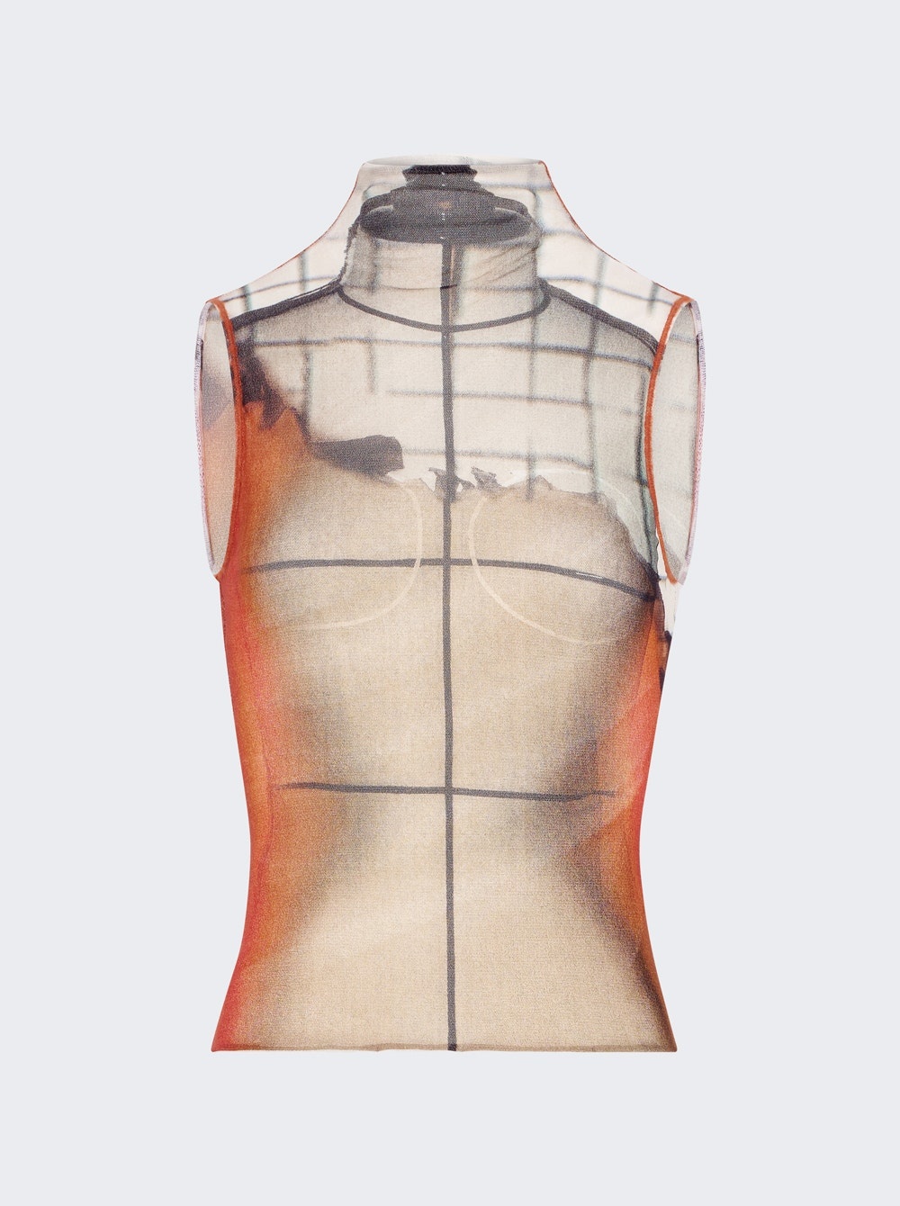 Details - Mesh tank top with "Fire" print and draped lining - Tight fit, stretchy material - Mock turtleneck - Material: 100% polyamide Size Information: Vendor Color Code: Brand Style: 25/03-W-TO307-M003P-150100 Designer/Brand: JEAN PAUL GAULTIER