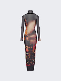 Mesh Turtleneck Long Dress Red Pigalle Print