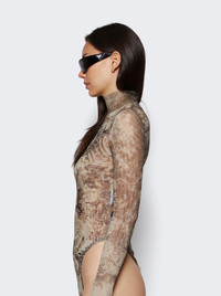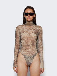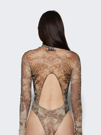Open Back Mesh Bodysuit Beige Médaillon Print