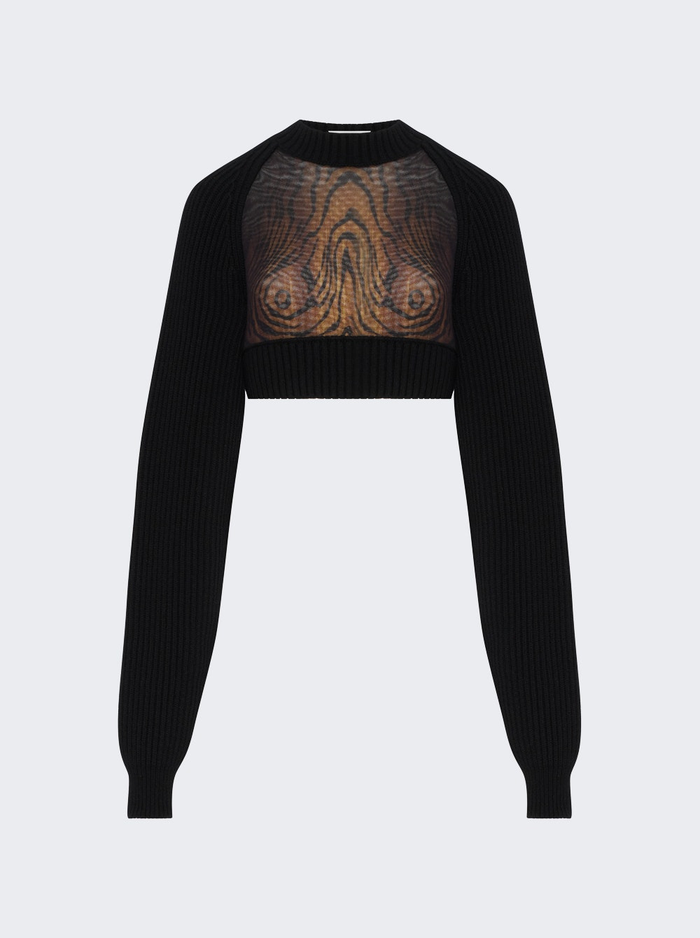 Details - Paneled lamb wool and mesh sweater - Ribbed wool - Mesh cut-out with "Wood" print - Material: Wool, Polyamide Size Information: Vendor Color Code: Brand Style: 25/03-W-PO017-K002-0060 Designer/Brand: JEAN PAUL GAULTIER