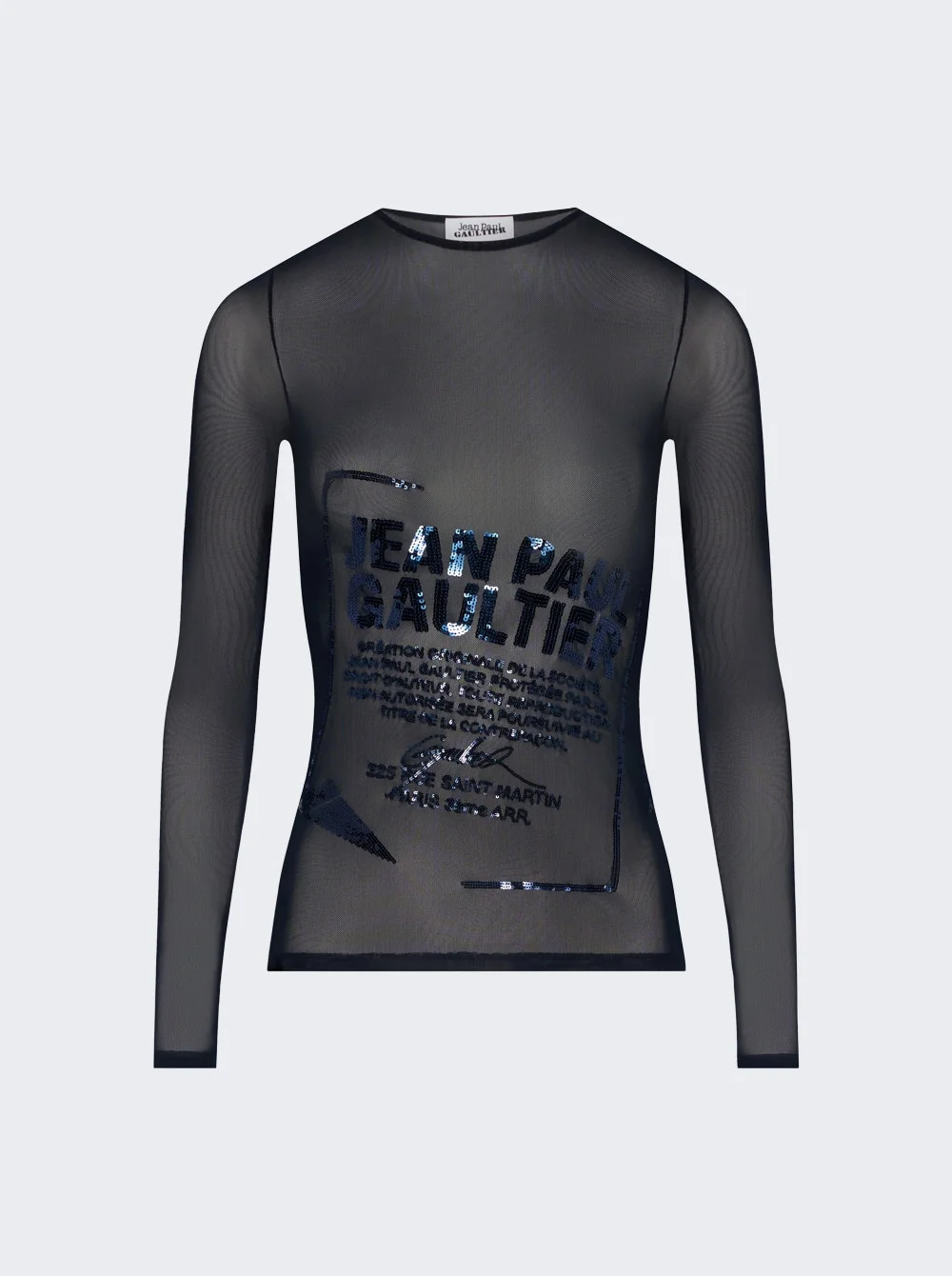Details - Sheer mesh long sleeve top - Embroidered sequin logo across the front - Tight fit, stretchy material - Material: 94% Polyamide, 6% Elastane Vendor Color Code: Brand Style: 25/04-W-TO381-M001-59 Designer/Brand: JEAN PAUL GAULTIER