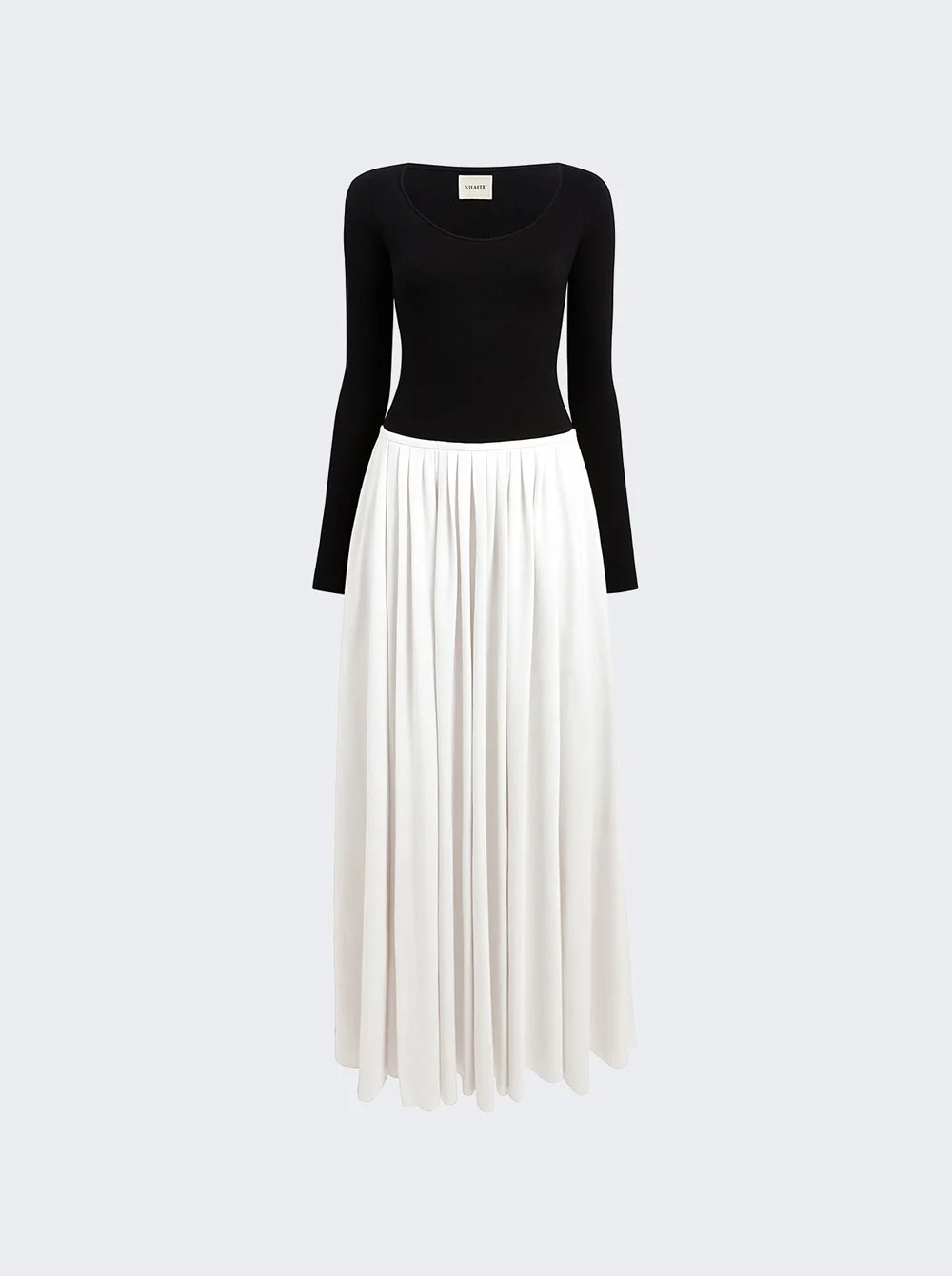 Details - Maxi length - Scooped neckline - Long sleeves - Concealed zipper closure at side - Pleated skirt - Care according to label - Material: 100% Silk, 100% Cotton Vendor Color Code: Brand Style: 55981012 Designer/Brand: KHAITE