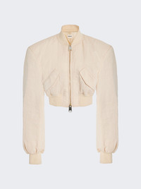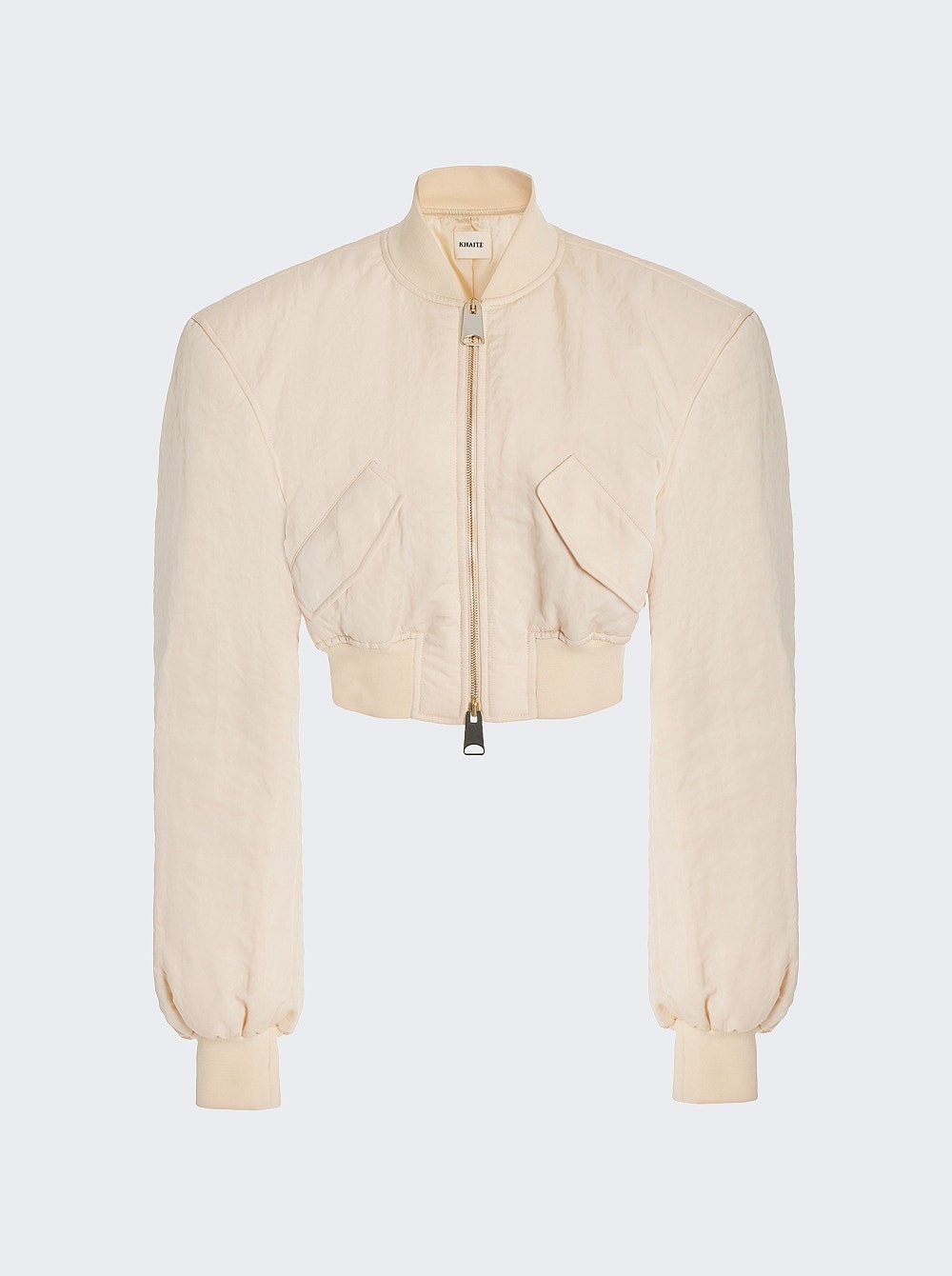 Details - Cropped bomber jacket - Strong shoulder - Textured satin - Bold zipper - Tonal knit collar, hem, and cuffs Dimensions: Model is 5'9"/175cm and is wearing a size S Composition: 100% polyamide; lining: 100% cupro Care: care according to label Brand Style: 61204080 W4080 Designer/Brand: KHAITE