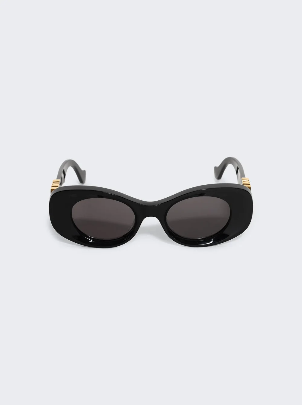 Details - Oval-shaped sunglasses in beveled acetate - Shiny black frame with smoke lenses - UVA/UVB protection - Gold-finish metal Anagram - Material: Acetate - Lens width: 1.9in; Bridge width: 0.8in; Temple length: 6.1in Vendor Color Code: Brand Style: LW40175U@4901A Designer/Brand: LOEWE