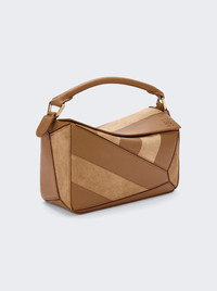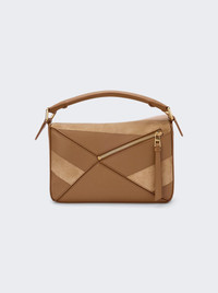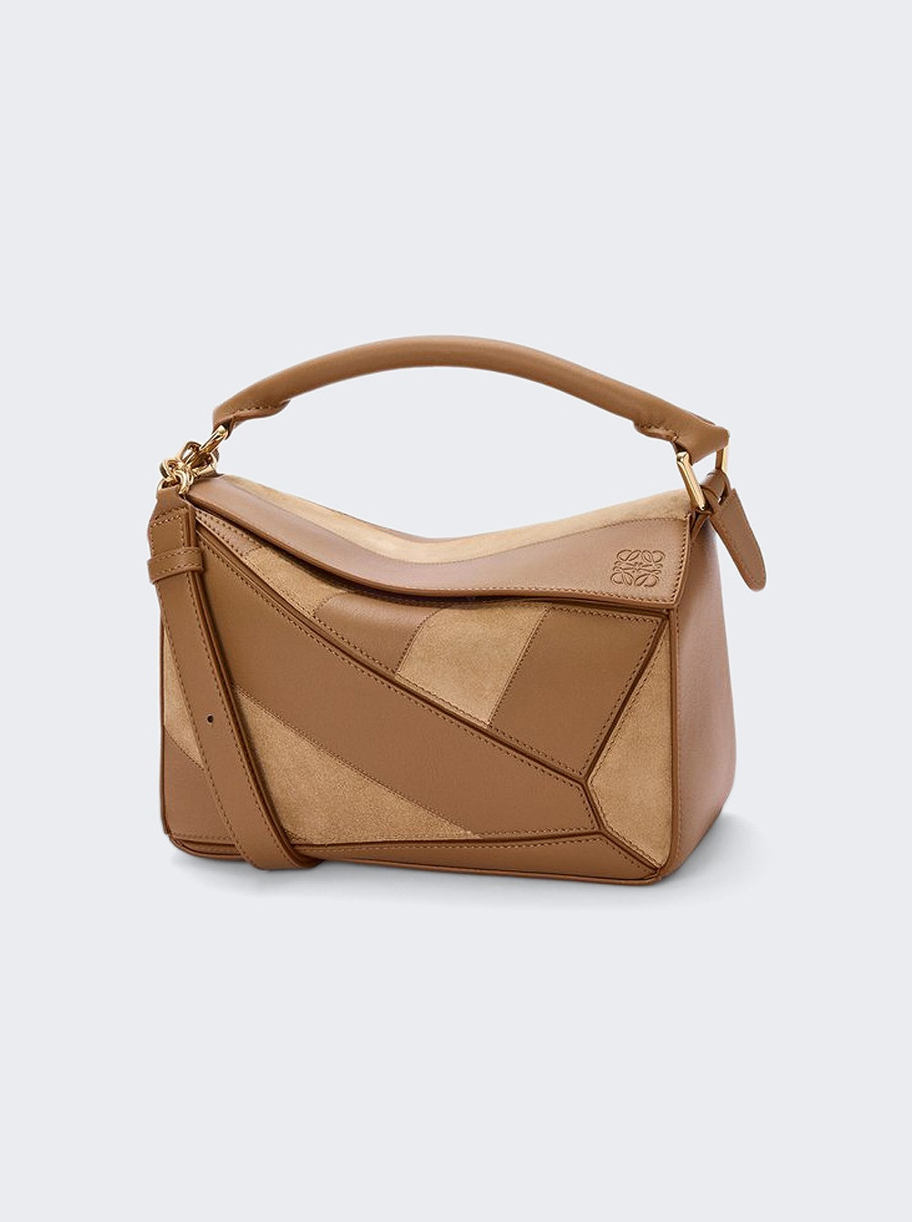 Details - Signature puzzle bag with distinctive geometric lines and cuboid form - Calfskin and suede stripes - Shoulder, crossbody, or hand carry - Detachable and adjustable strap - Zip closure with calfskin pull - One external zip rear pocket, one internal slip pocket - Suede lining - Embossed Anagram - Material: Calfskin and suede leather Size Information: Vendor Color Code: Brand Style: A510S21XBR Designer/Brand: LOEWE