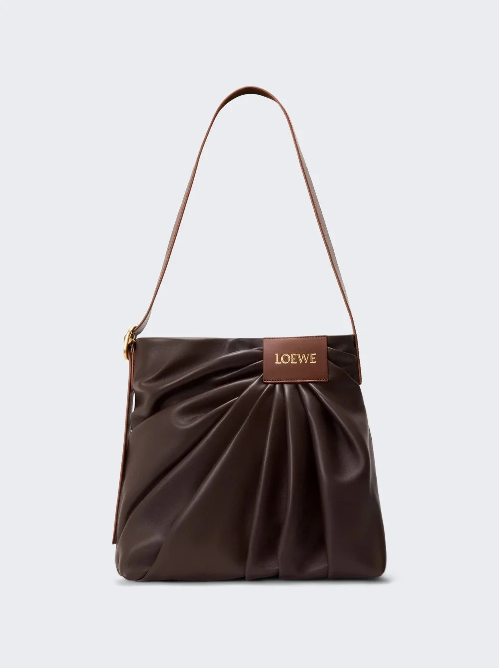 Details - Draped tote bag in mellow nappa lambskin leather - Soft, sculptural shape - Wide, adjustable leather strap with a LOEWE-engraved buckle - Shoulder or crossbody carry - Magnetic closure - One internal calfskin patch pocket - Herringbone cotton canvas lining - Gold embossed LOEWE - Material: Nappa Lambskin Size Information: Vendor Color Code: Brand Style: ADHBDPTX01 Designer/Brand: LOEWE