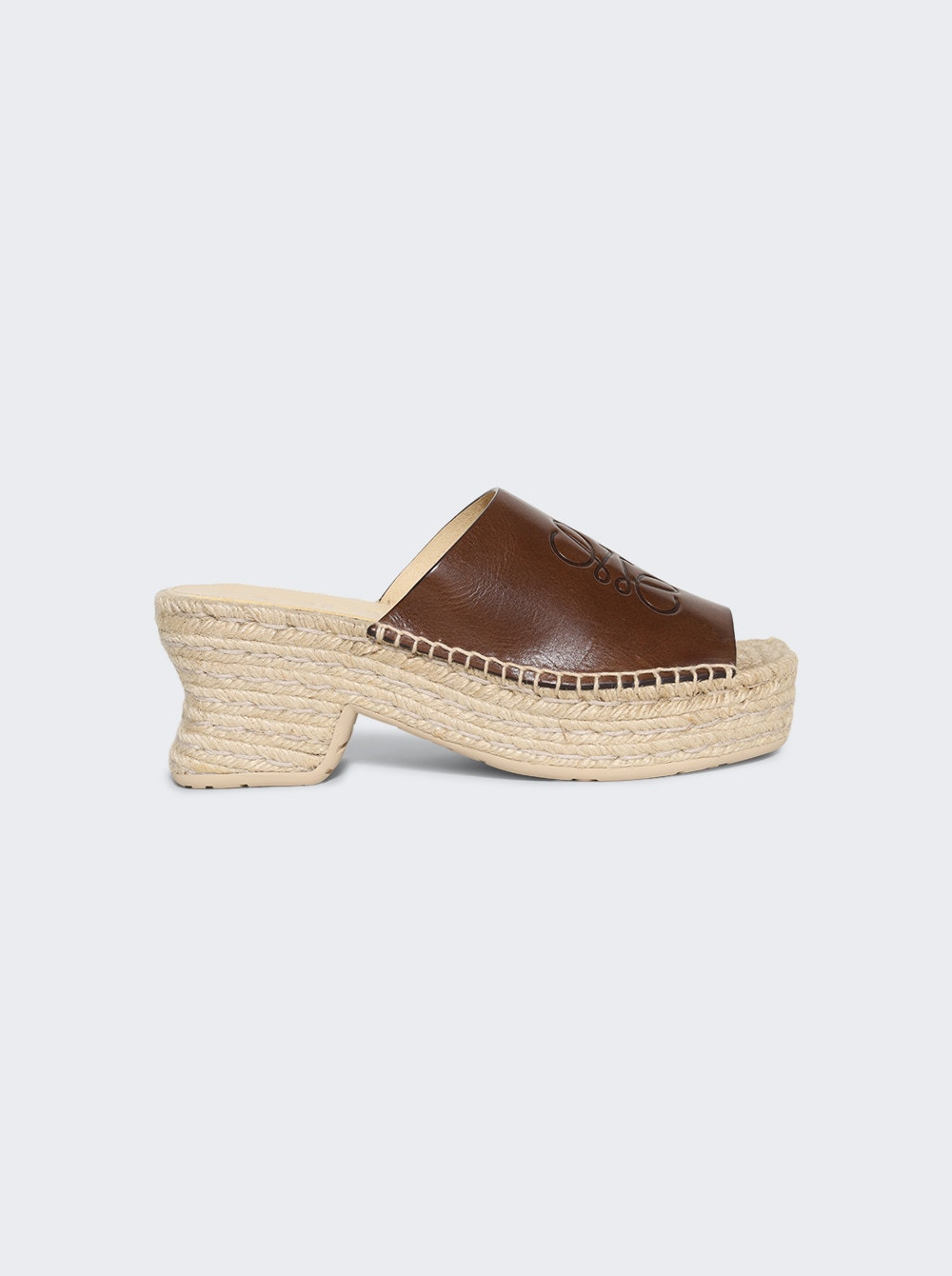 Details - Espadrille platform slide sandal - Vegetable-tanned calfskin leather - Signature petal toe shape - Embossed Anagram - Handmade jute sole, leather outsole - Suede lining - Heel height: 80mm, including a 45mm platform - Material: Vegetal calfskin leather, Jute Size Information: Vendor Color Code: Brand Style: L616465X73 Designer/Brand: LOEWE